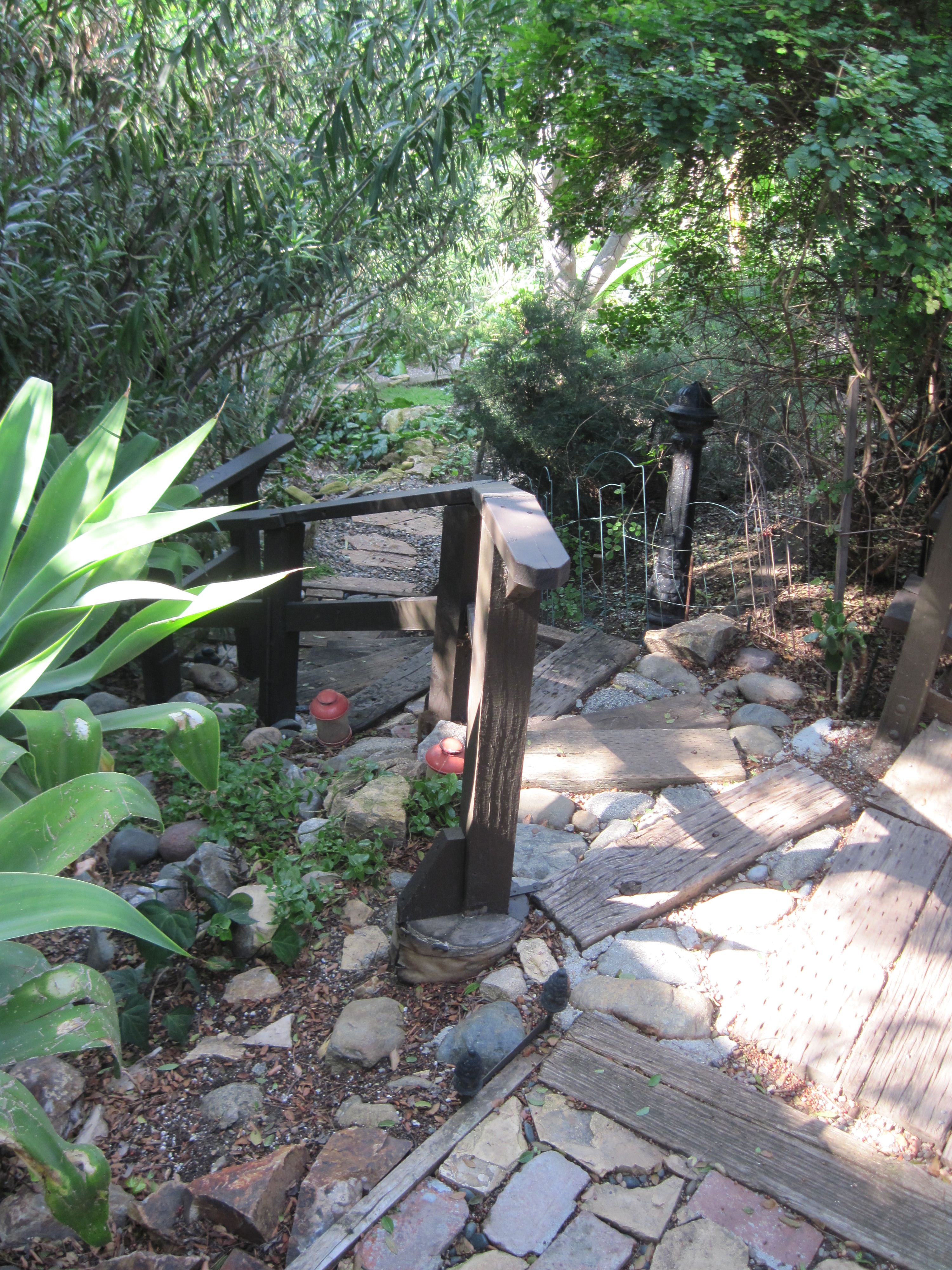 With our unerring bad timing, Ed and I already have converted our yard so no rebates for us. We replaced what little grass existed on our pretty-much vertical back yard with rocks and gravel paths, stepping stones surrounded by smaller stones and pebbles, wood steps and decking. Our reason for doing so, back when it rained in California, was to minimize muddy dog-paw prints inside the house.