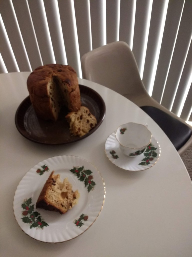 The store was, like the post office and the streets outside, sparsely occupied so we were able to continue our discussion of panettone. “It’s Italian, isn’t it?’ she asked. “Yes,” I replied, “and I’m half-Italian. But I don’t remember it being a fixture on my grandparents’ holiday table except only occasionally, perhaps brought to them as a gift. I was sure I wouldn’t like it, so it was not until way into adult years that I learned I’d been missing something. A dessert not too sweet, with a consistency somewhere between cake and bread. “How do you eat it? Do you heat it up?” she asked. “No,” I answered. “I just grab off chunks and eat it with a glass of chilled white wine before dinner.” ( However, in the past I’ve been known to eat chunks of it in the car, without wine, while driving home from the store.)
