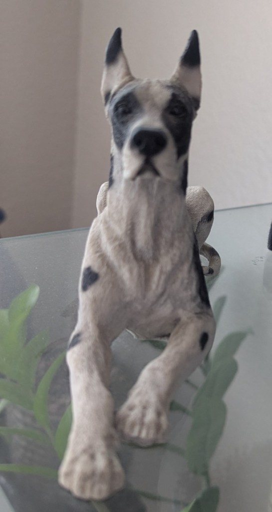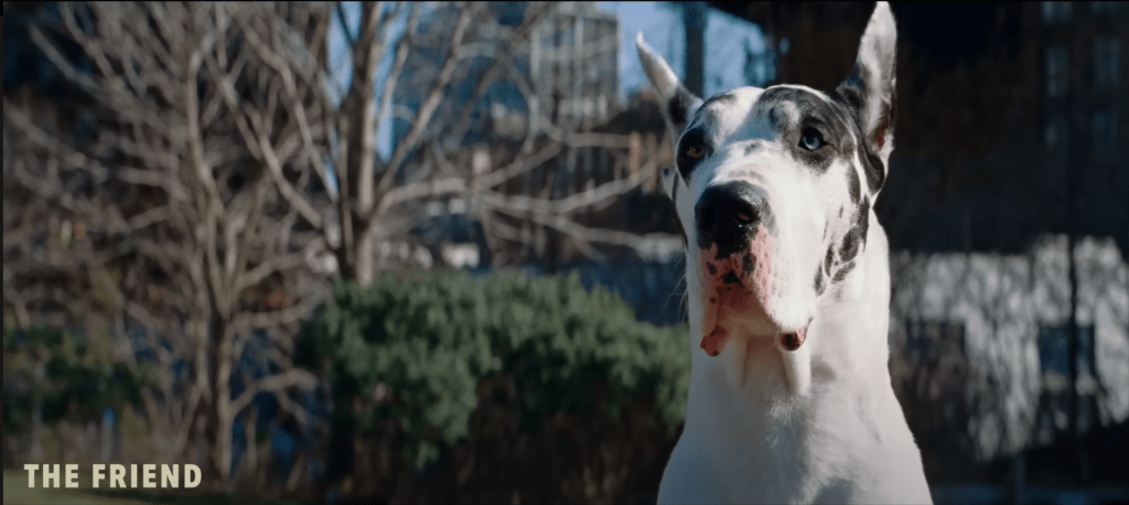 Note about the art: At the top of the page, you will see my beloved Great Dane bookends (credited by the artist, Louise Peterson, as “Claynines”). We collected a lot of Great Dane art over the years — including several sculptures by Peterson (you can find her website here: www.danesculptor.com). A friend recently tried to count all the Great Dane art (including everything from sculptures and paintings to calendars and fridge magnets) in my apartment. I think she got to 80, but might have missed a few. After I saw “The Friend,” I was pleased to see one of my Dane figurines had similar black-and-white coloring as Bing.