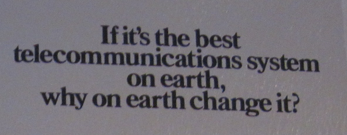 More important, though, is the matter of historical context. Increasingly, I am noticing that I draw blanks from younger people at certain points in the stories I have been telling for years. Like the time I mentioned that my husband had spent his career at the former Bell System. The young person to whom I imparted that information said, “What’s that?” “That,” for any young person reading this, was the nationwide telephone system whose efficiency was admired around the world and whose breakup in 1984 mystified the company’s counterparts overseas. “If it’s the best telecommunications system on earth, why on earth change it?” was the headline on an ad at the time in which the company tried to explain itself. My husband, who had a hand in creating that ad, said the company caved because an antitrust suit was threatening to drag on for years. And AT&T wanted to be able to compete in the marketplace that was changing the telephone business. Things such as those that now enable blogging and tweeting and the like.